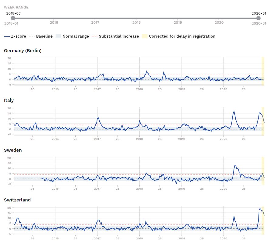 Dies wäre ein Beweis, dass der schwedische Weg zur Herdenimmunität durch Ansteckung nicht ganz falsch war. Auch wenn die Schweden den Schutz der Heimbewohner anfangs ebenso wie wir vernachlässigt hatten, zeigen die Daten von EuroMOMO, dass es dort während der zweiten Welle keine hohe Übersterblichkeit (gestrichelte, rote Linie) gibt. Nur in der 49. Kalenderwoche liegen die Meldedaten leicht über dem langjährigen Durchschnitt. Auch in Berlin gibt es keine Übersterblichkeit, obwohl meine Stadt in Bezug auf Inzidenz, Intensivbetten und Co. laufend in den Schlagzeilen steht. In Italien und der Schweiz sieht dies leider ganz anders aus.