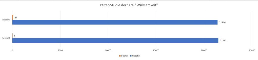 Von 21.500 gesunden Menschen, die ein Placebo erhielten, haben sich demnach 86 Personen angesteckt; bei 21.500 geimpften Personen jedoch nur 8 Personen. D.h von den Ungeimpften hatten sich 99,6% nicht angesteckt und von den Geimpften 99,9%.